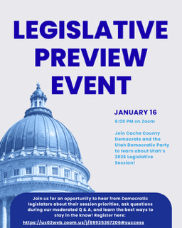 I also want you to keep your calendars open for a couple of exciting events that are coming up. First, we have a legislative preview on this Friday evening at 6PM. This will be virtual that you can access here: https://us02web.zoom.us/j/89935367206 Meeting ID: 899 3536 7206. Representative Angela Romero and Senator Kathleen Riebe will discuss with us priorities for the Democratic party for the upcoming state legislative session. Clare Collard our National Committeewoman will be moderating this discussion and we would love for you all to tune in and show them Cache Valley is paying attention and we care about our state.
